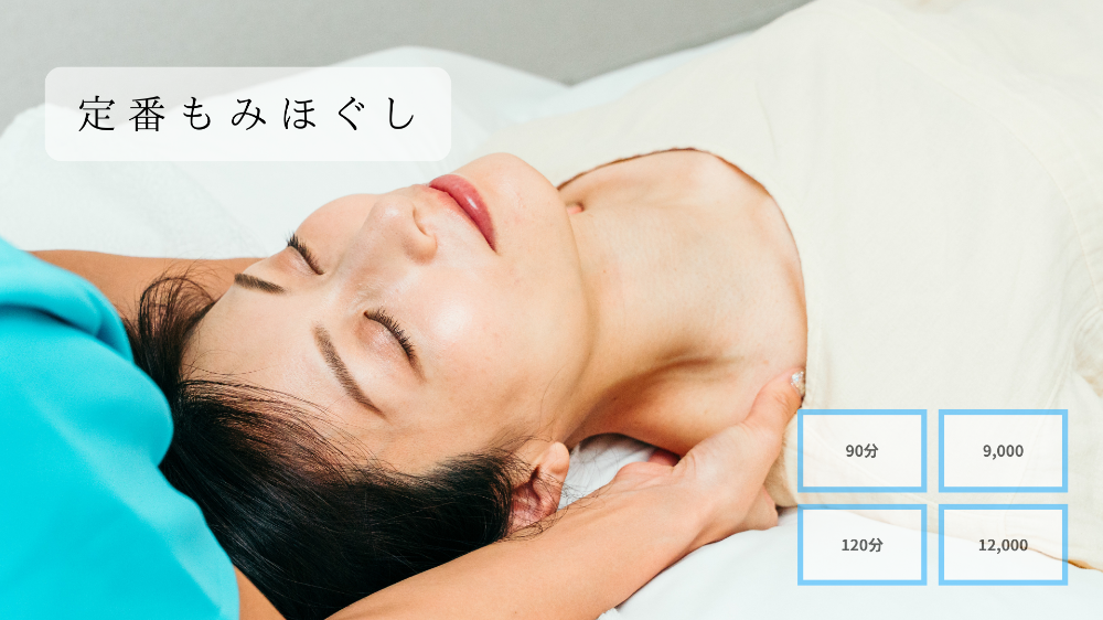 8割以上のお客様が選ぶ定番メニューです。もみほぐし90分+ヘッドスパ30分がダントツ1番人気です!