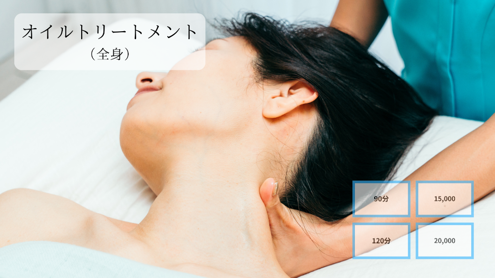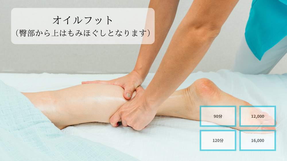 下半身オイル・上半身もみほぐしのメニューです。足のむくみが気になる方やオイルが初めての方はこちらを!(女性限定メニュー)